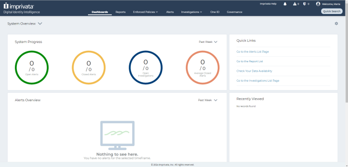 Dashboards provide a high-level overview of the health of your organization using the data that you monitor. Dashboards pull all the information that you own, including Alerts, Reports, and Enforced Policies, into singular views.