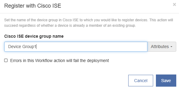 This action allows you to register devices with Cisco ISE. The Workflow action is run at the Launchpad. In case of a multi-phase deployment, it is run in the first phase.