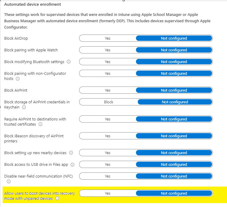 In the Automated device enrollment section, switch the Allow users to boot devices into recovery mode with unpaired devices setting to Yes.