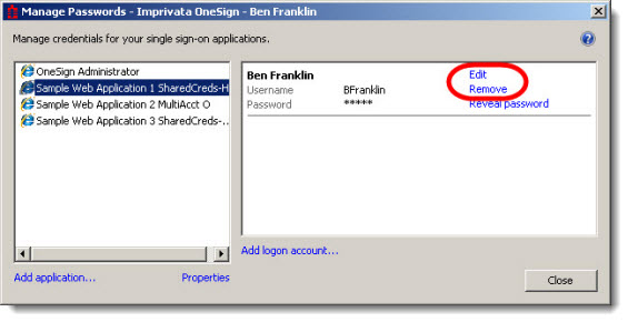 Users can edit the application display name, username, and password. To make this feature more secure, you can require the user to answer security questions to reveal application credentials from the Self Service Portal. In the Password Manager, the password remains obfuscated unless the application also permits passwords to be revealed. See Allowing Users to Reveal Application Passwords