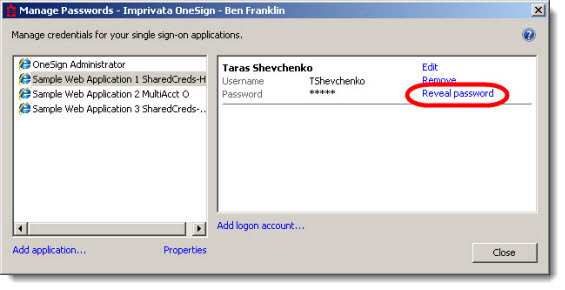 If you want to permit users of this application to reveal their passwords in the password manager or in the Password Self Services feature, select Allow users to reveal application passwords. For example, in the following image this application user can reveal his application password: