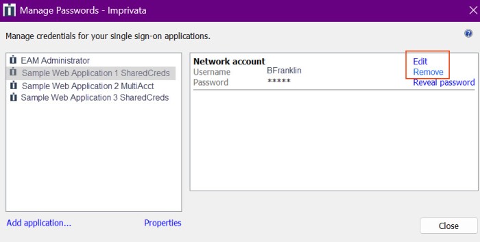 Users can edit the application display name, username, and password. To make this feature more secure, you can require the user to answer security questions to reveal application credentials from the Self Service Portal. In the Password Manager, the password remains obfuscated unless the application also permits passwords to be revealed. See Allowing Users to Reveal Application Passwords