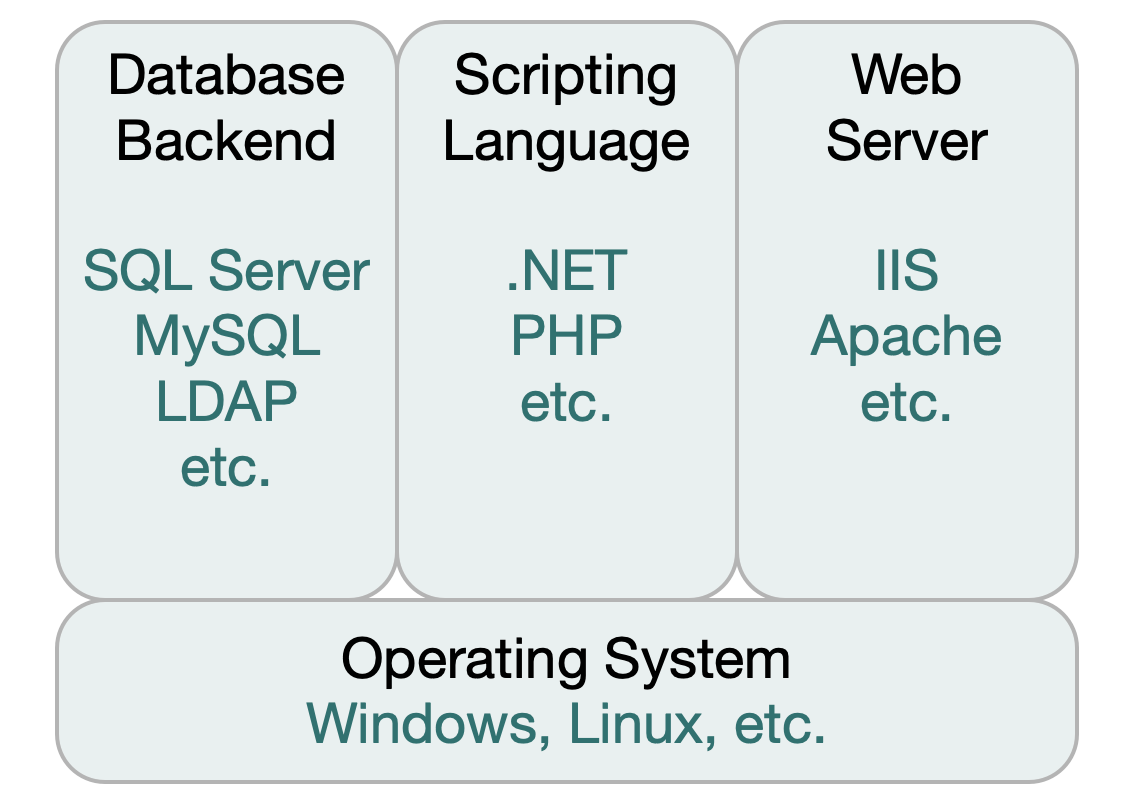 A typical implementation will use a virtual machine running Windows or Linux. The VM will run a web server, scripting language and possibly a database backend. We encourage you to use the systems and scripting languages most familiar to your staff.
