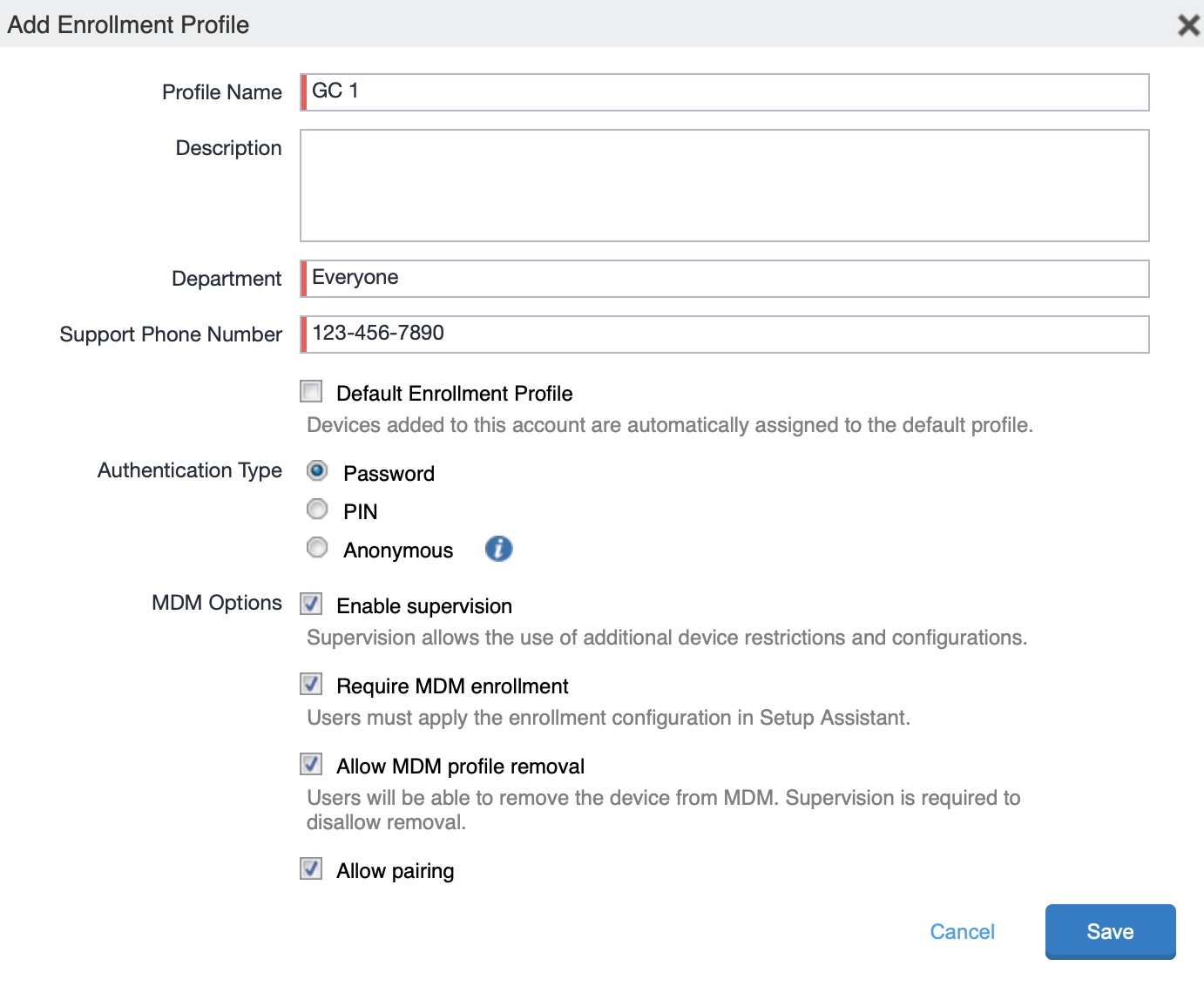 This setting must match the authentication setting in the enrollment profile you assigned to the device in MDM. If you choose to Authenticate, provide the username and password for the MDM enrollment user. You may also pull this information from any attributes you have defined. This way every device may be assigned to a different user.