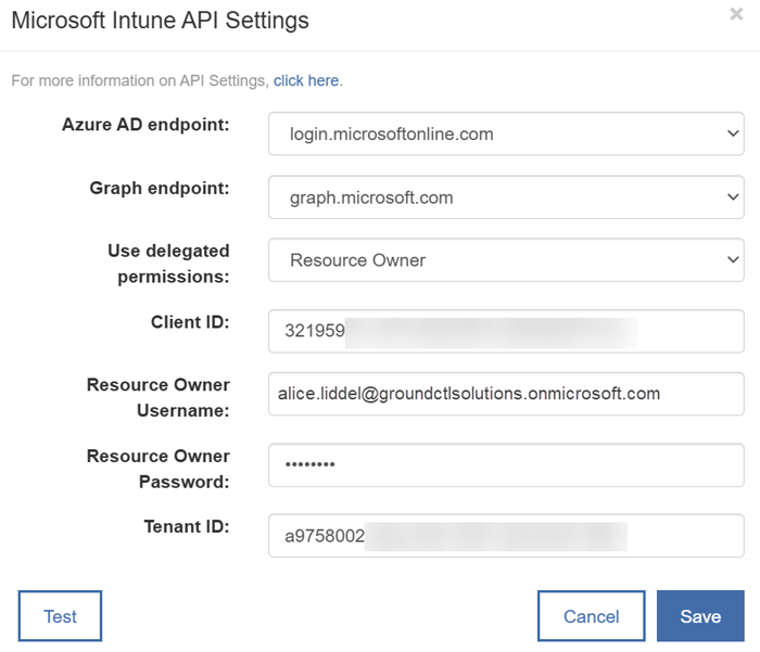 In the Microsoft Intune API dialog, configure the following information: