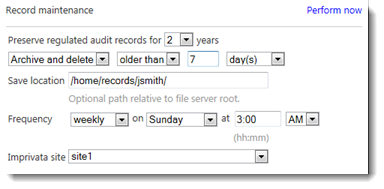 • The Record maintenance section, which allows you to archive and/or delete audit records and schedule audit log maintenance. See Maintaining Audit Records.