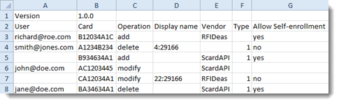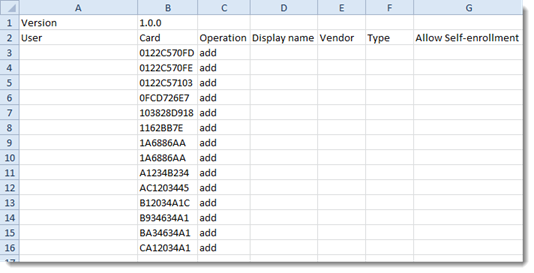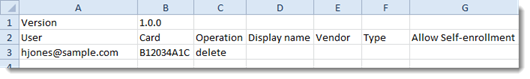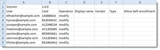 In the example CSV file below, the User field includes the user@domain data for each card, and Operation is set to add. Allow Self-enrollment does not need to be set.
