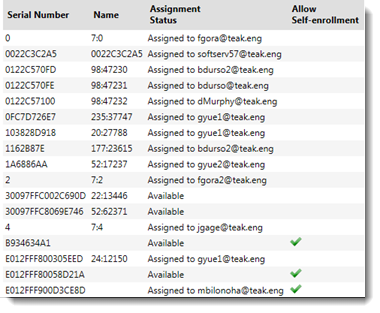 In the Imprivata Admin Console, go to the Devices menu > Proximity cards page. The table lists all the proximity cards that are assigned to users and cards that are available to be assigned.