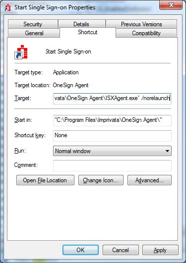 - Create a shortcut to ISXAgent using the following command: "C:\Program Files (x86)\Imprivata\OneSign Agent\x64\ISXAgent.exe" /norelaunch
