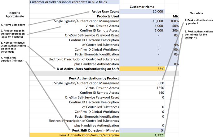 To estimate the maximum number of user authentications per minute needed for your enterprise at peak usage, use the sample information in the graphic below as a general guide. Peak usage typically occurs at or near the start of a major work shift. Your Imprivata sales engineer or support person can help you with this estimation.