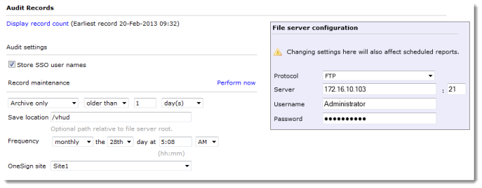 • The Record maintenance section, which allows you to archive and/or delete audit records and schedule audit log maintenance. See Maintaining Audit Records.