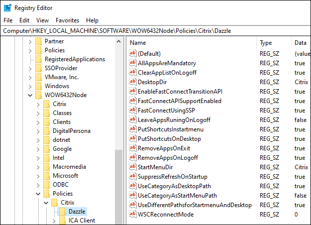 64—bit – HKEY_LOCAL_MACHINE > SOFTWARE > Wow6432Node > Policies > Citrix > Dazzle