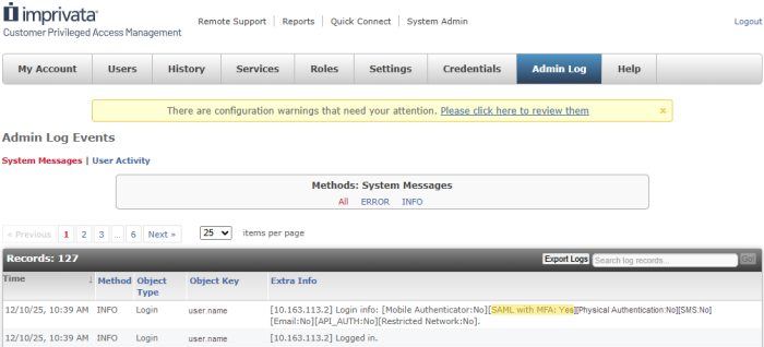 | Admin Log shows “SAML with MFA: No”. | The IdP did not assert MFA in the SAML response. | Confirm that MFA is required in the IdP. Review the Advanced Settings section. |